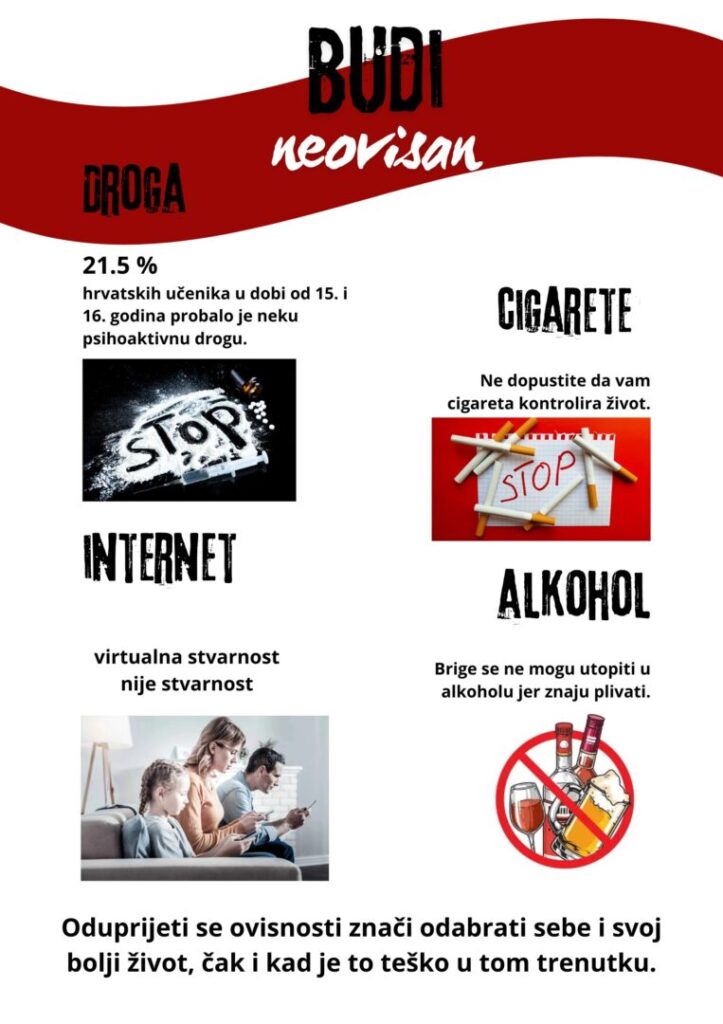 Sve smo zaokružili izradom digitalnih i tiskanih plakata kojima se skreće pažnja na ovisnosti i potiče da kroz svoj život uvijek kročimo slobodni – (NE)OVISNI!