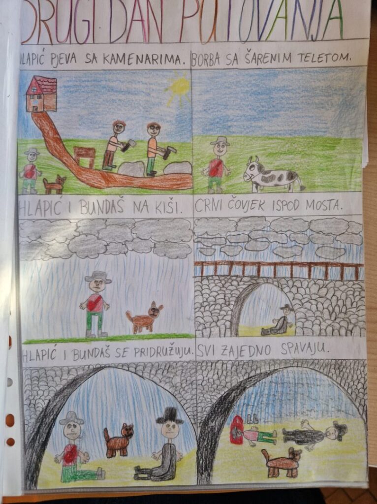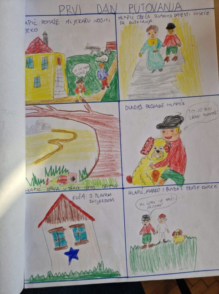 Svaki dan Hlapićeve pustolovine učenici su prikazali kroz osam kadrova, pažljivo osmišljavajući tekstove, crtajući likove i prikazujući najvažnije događaje. Na taj su način istaknuli ključne trenutke Hlapićeva putovanja, ali i svojom maštovitošću i trudom pokazali kako književno djelo može oživjeti na sasvim novi način.